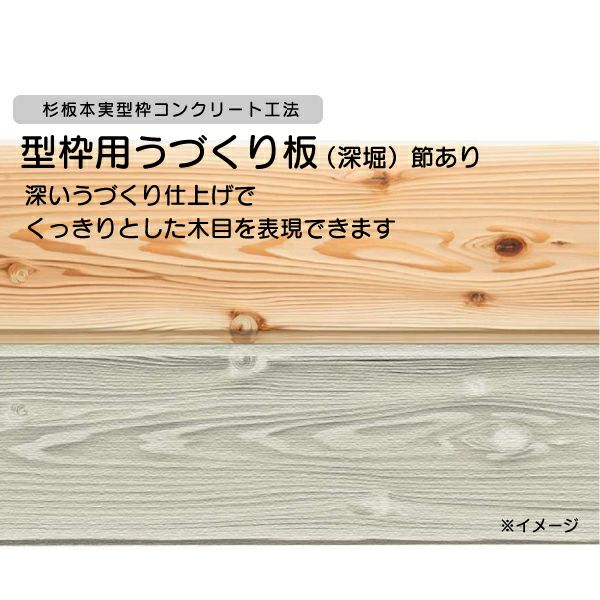 「杉の本実型枠コンクリート工法用 うづくり板 節あり130幅」は、木材の美しい木目模様をコンクリートに転写するための型枠材として開発された製品です。この板を使用することで、木の自然な風合いとコンクリートの強度を融合させた、独特のデザインをコンクリート壁面に表現することができます。