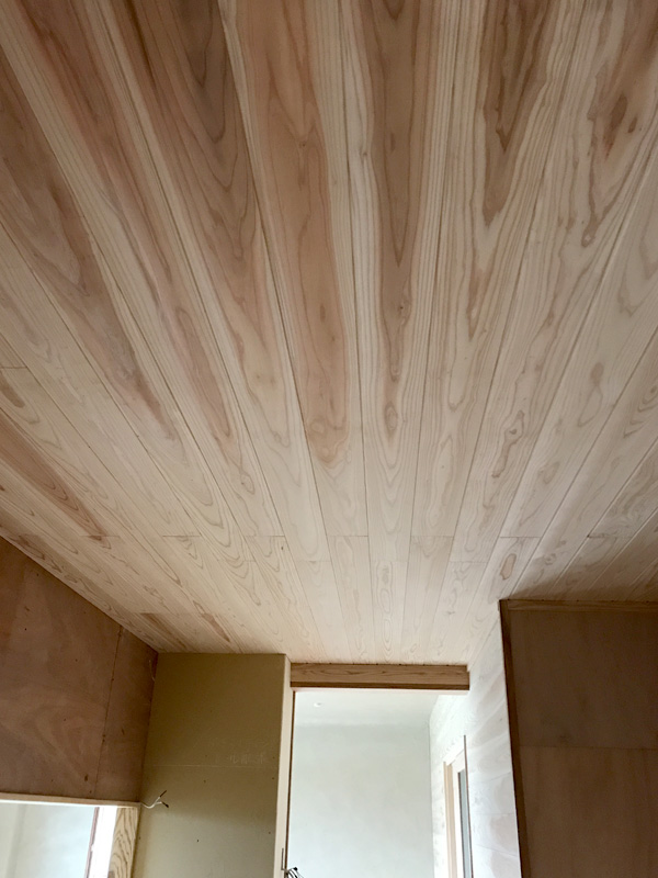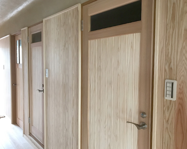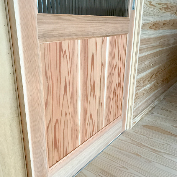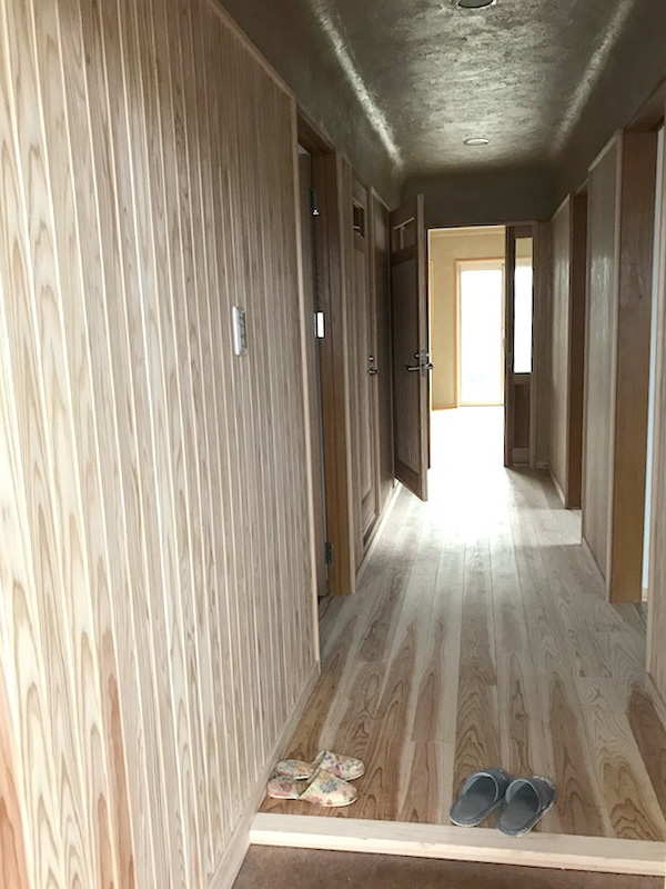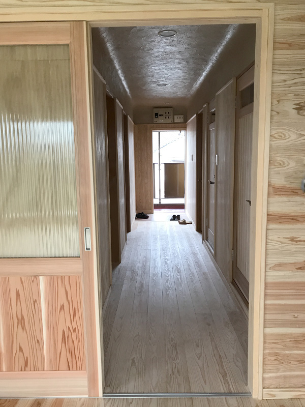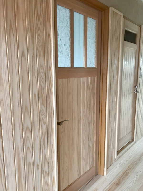 廊下の壁に施工した、杉の羽目板とおそろいの板で、