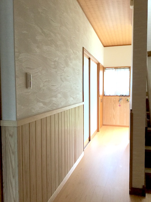 玄関、 廊下は旅館風に意識して和風にする為こちらもクロスを張り替え、 腰壁に。