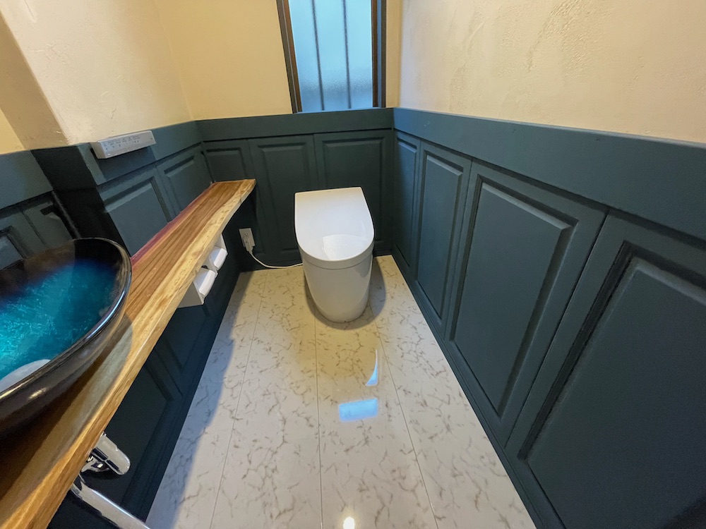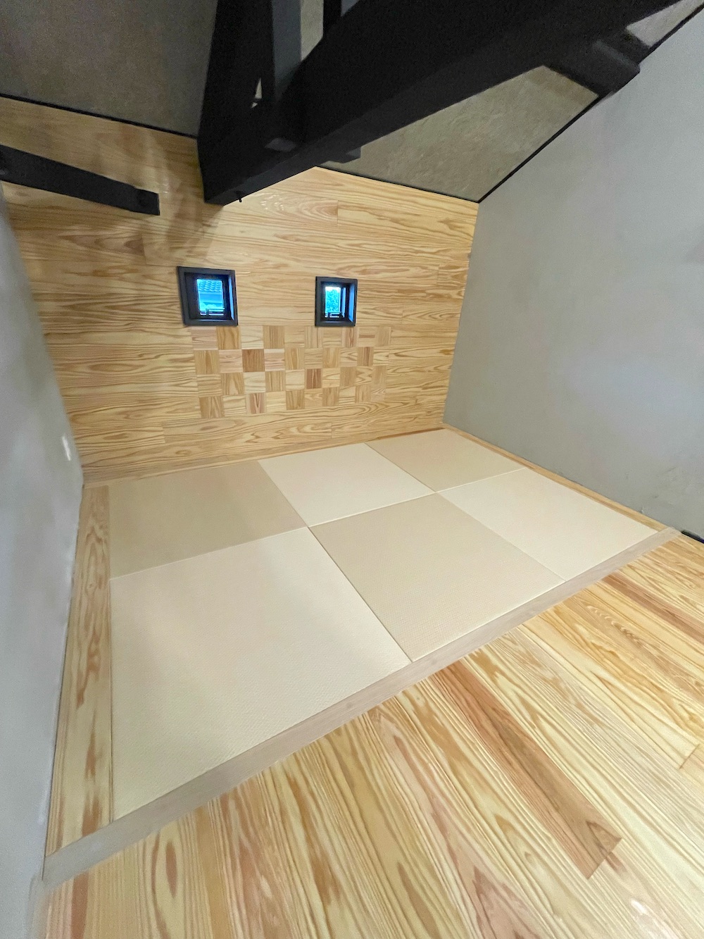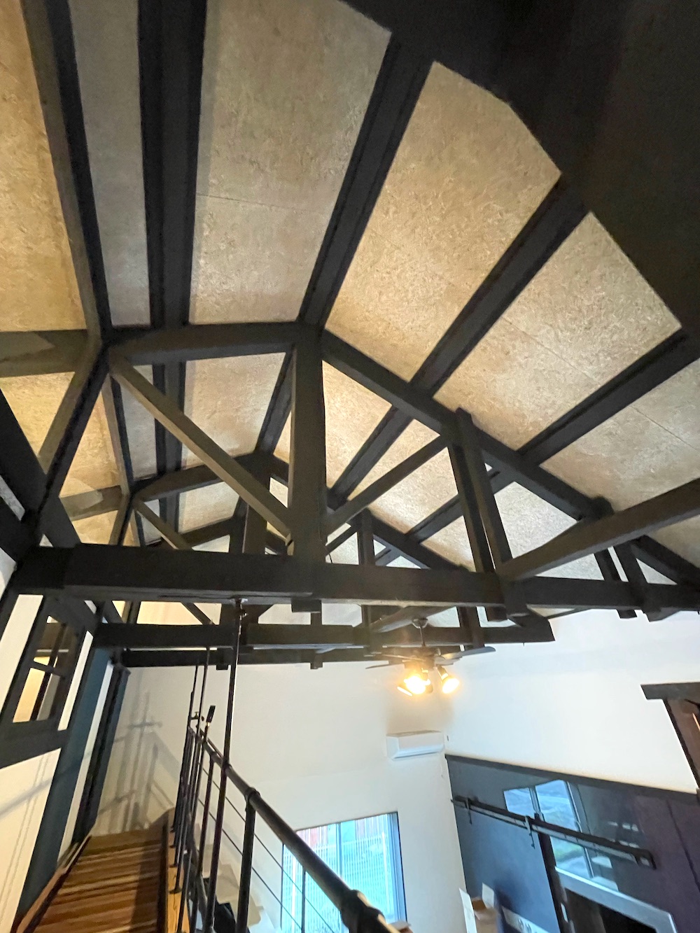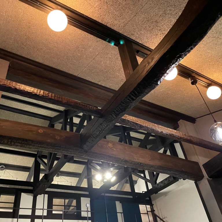 無垢の杉うづくり床や、迫力のある古材の梁、カラフルな木材の組合せ、個性的なタイル
