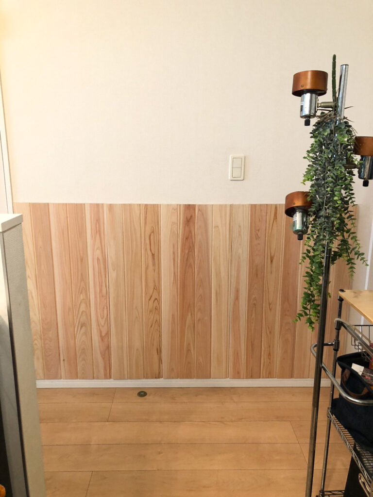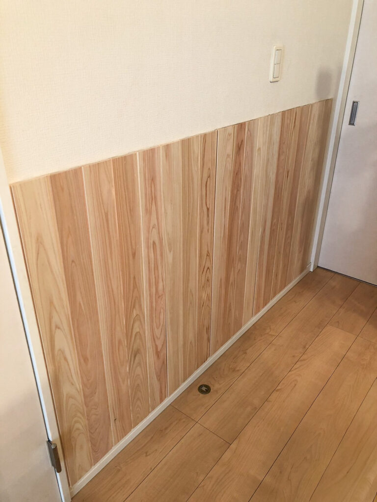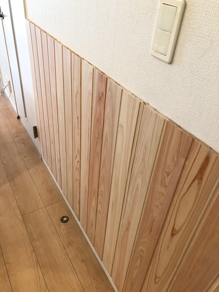 今回は、お部屋の一角にヒノキの腰壁を施工されたお客様の事例をご紹介いたします。